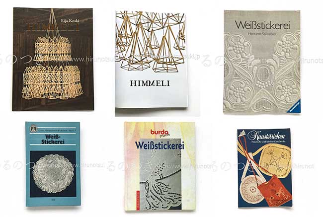 ドイツの白糸刺繍、フィレ・レース、ヘムステッチ、かぎ針編みの本など入れました。