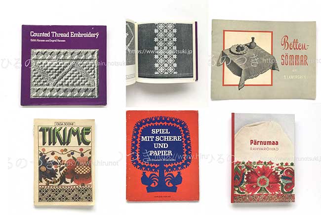 フレメのカウント・ステッチ本、エストニアの民族衣装・刺繍本、ドイツの絵本、スウェーデンのドロンワーク(ボッテンソム刺繍)図案集などいれました。