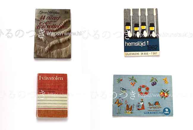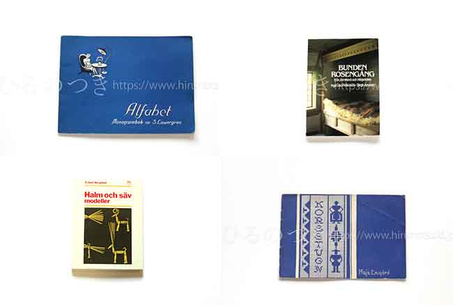スウェーデンから届いた刺繍図案集、わら細工本、織物本などを入れました。