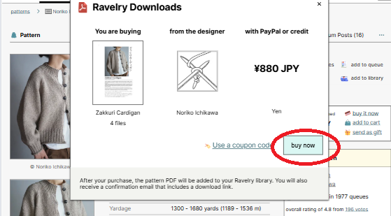 1.Ravelryにログイン後、購入を希望するパターンのページに行き、「Buy it now」をクリックします。(ちなみに同じところにある「¥〇〇JPY」は〇〇円の意味です。またその下の「add to cart」を押すとカートにパターンが入り、カートに入れた他のパターンと合わせて一度に決済ができます)