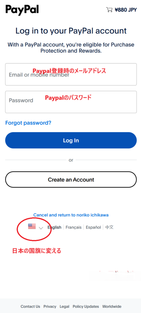 3.Paypalのサイトに飛ぶので、プルダウンメニューの国旗を「Japan」に変え(変えると日本語になります)、入力欄の上段にPaypal登録時に使用したメールアドレス、下段にパスワードを入力(参考LINK:Paypalでの支払い方法→google検索・https://www.google.co.jp/search?q=Paypal+支払い方法)。